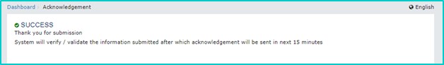 - Post submitting the application, the system will display a success message and acknowledgement mail will be received on registered e-mail address and mobile phone number.