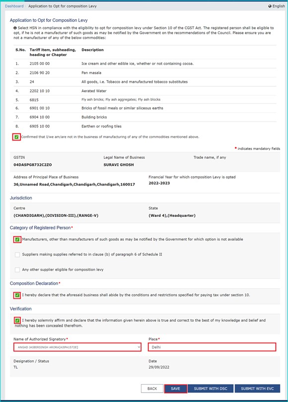 - Select “yes” to the question “Opting for Composition Scheme”