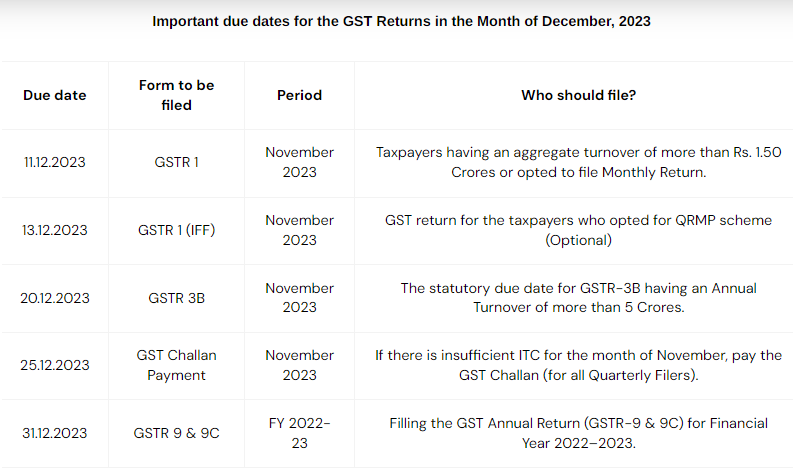 - 11/12/2023: Due date for filing GSTR 1 for November 2023