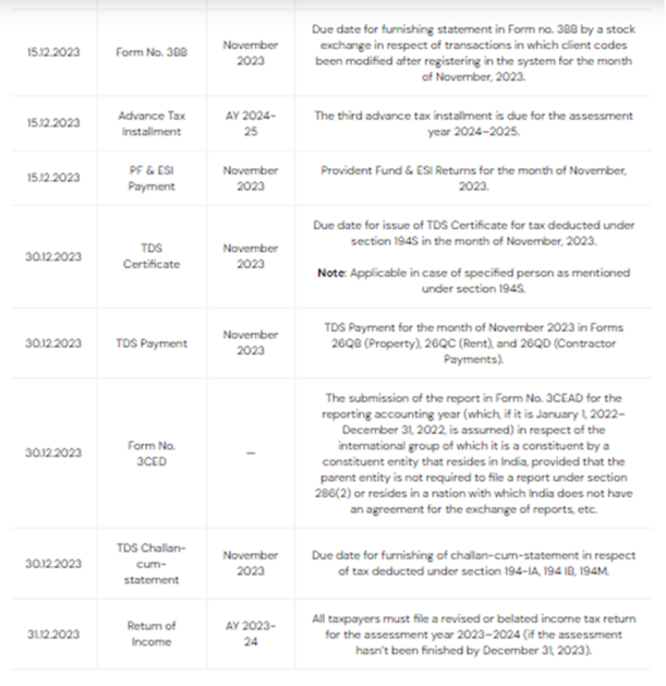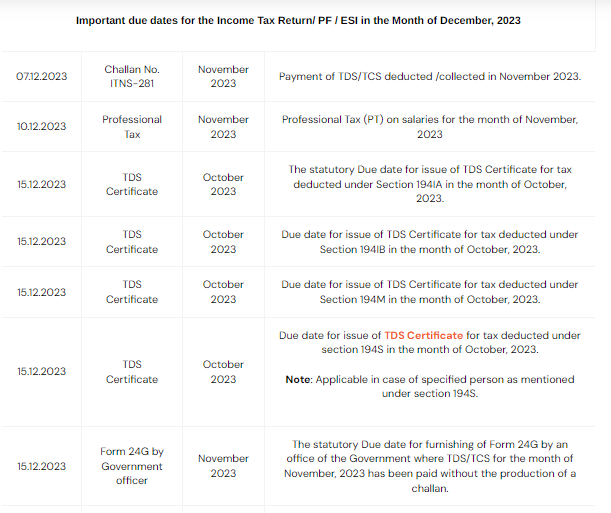 Mentioned below are the important due dates for the Income Tax Return (PF/ESI) for December 2023