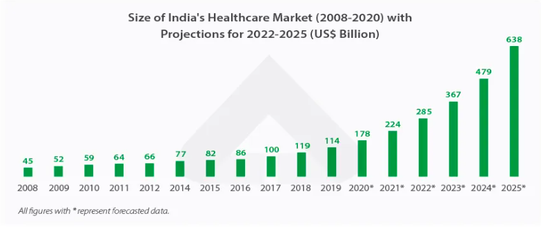 Healthcare plays a significant role in socio-economic life for a developing country like India. These include hospitals, clinical establishments, pharmaceuticals, medical equipment, health insurance, telemedicine, medical tourism, etc. Studies indicate that the Indo-health market is projected to reach $372 billion in 2022.