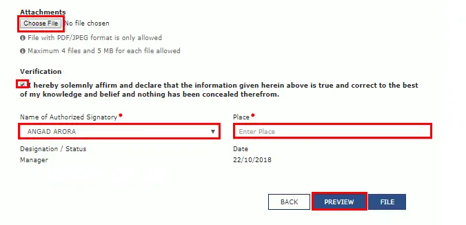 - Post entering the entire information and uploading documents, the reply can be submitted through DSC or EVC verification.