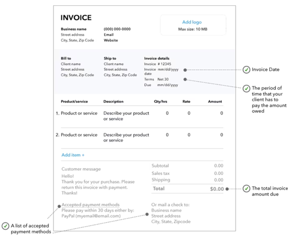 The image below from intuit quickbooks shows a typical invoice with its unique features: