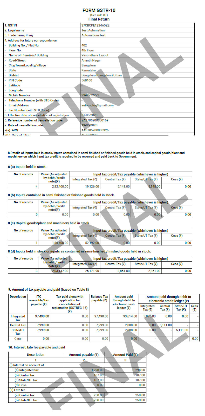 Sample PDF format of FORM GSTR-10