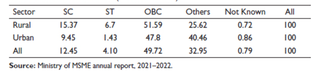 Business owners from OBCs accounted for 49.72% of MSMEs owned by socially disadvantaged groups, while SCs owned 12.45% and STs 4.10%, according to statistics from the 73rd round of the National Survey of Small and Medium Enterprises (NSS). Minority groups held nearly 73.67 percent of micro, small, and medium-sized enterprises (MSMEs) in rural areas.