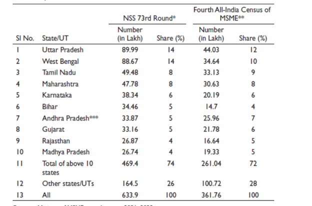 Small and medium-sized enterprises (SMEs) in India are more evenly distributed throughout states than major corporations. In the fourth all-India MSME Census, the three states of Uttar Pradesh, West Bengal, and Tamil Nadu accounted for closer to 31% of the total units; however, in the NSS 73rd cycle, they accounted for 36%.