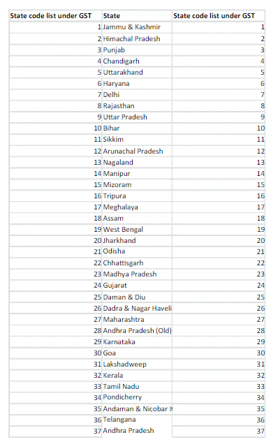 In our Indian taxation system, GST, the state codes are unique two-digit numeric codes assigned by the government to each state and union territory in India. For example, Delhi: 07, Andaman and Nicobar Islands: 35 etc.
