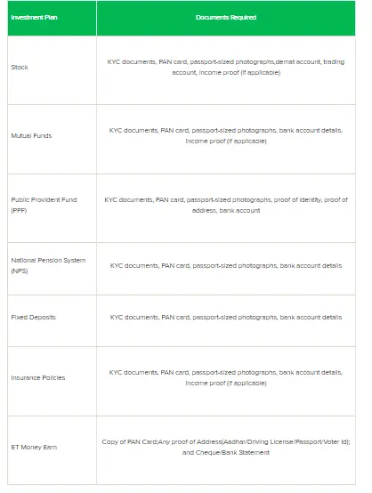 To participate in any investment avenue in India, you must give certain documents, such as KYC documents, bank data, Form 16, and so on. However, it differs by investment. The following table lists the required documentation for some of the most common investing options: